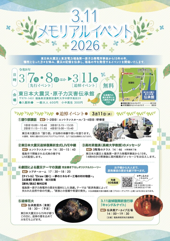 震災の記憶を風化させず、伝承していくために、福島の今を発信するイベント「3.11メモリアルイベント2026」が、双葉町の東日本大震災・原子力災害伝承館にて開催されています。